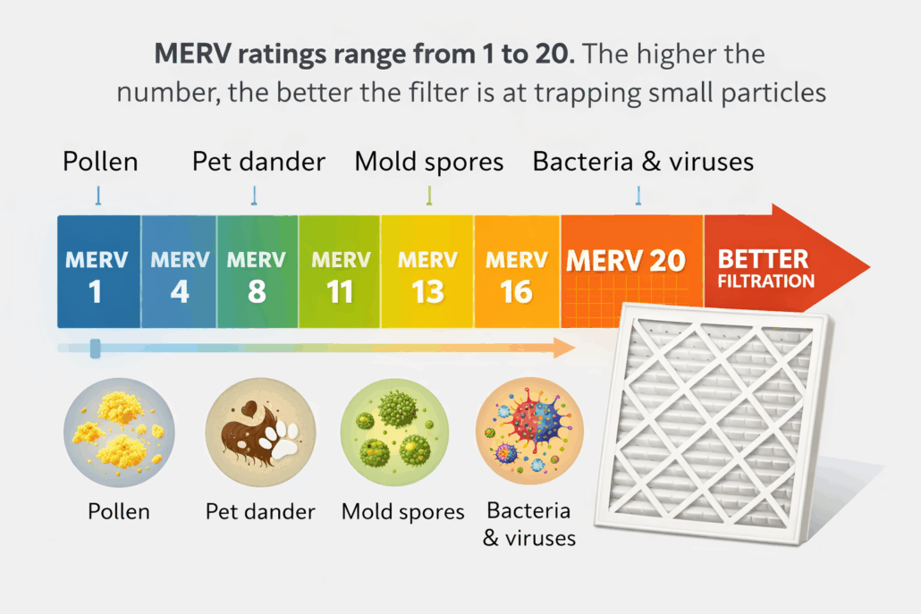 MERV ratings range from 1 to 20. The higher the number, the better the filter is at trapping small particles like pollen, pet dander, mold spores, and even bacteria and viruses.